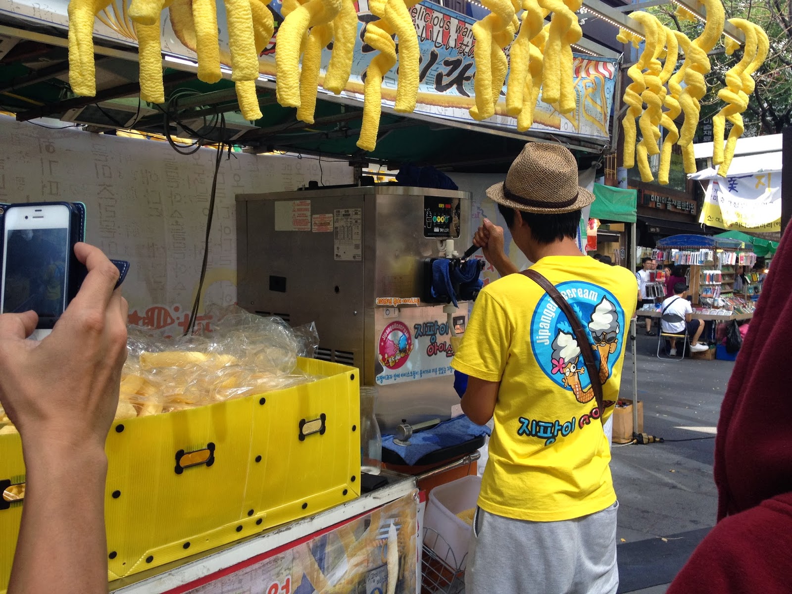 The actual Ewha University. The very special Sweet Potato Hollychinno. Shoe paradise! Push cart food outside our hotel. It's basically flour and brown sugar. Quite yum too. LOL Creepy Hello Kitty. Lunch + Dinner! Famous chicken! Tired and hungry. Actual chicken soup! Us. The noodles. Boil boil!